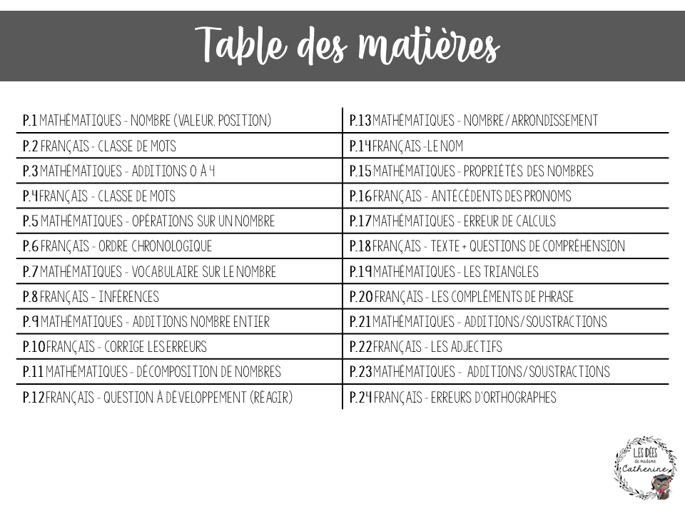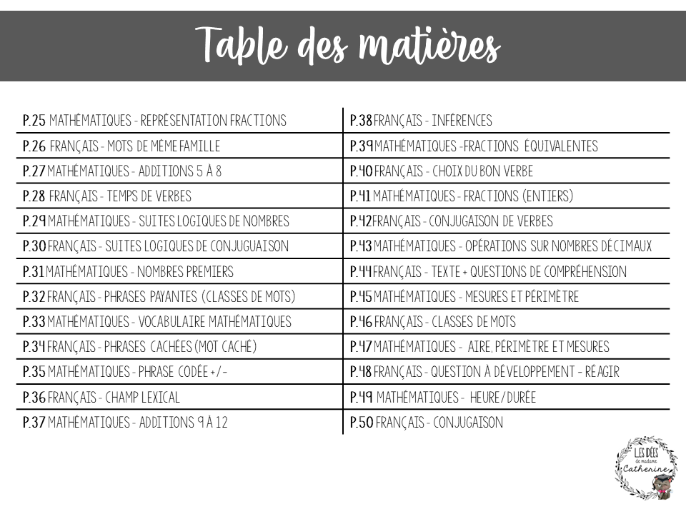Voici 50 pages de courtes activités de révision (25 en mathématiques et 25 en français). Sur chacune des pages se trouve un dessin à colorier pour occuper les élèves par la suite. De plus, vous trouverez un tableau de progression (ou l’élève doit cocher les pages complétées) qui permet de suivre le travail des élèves.