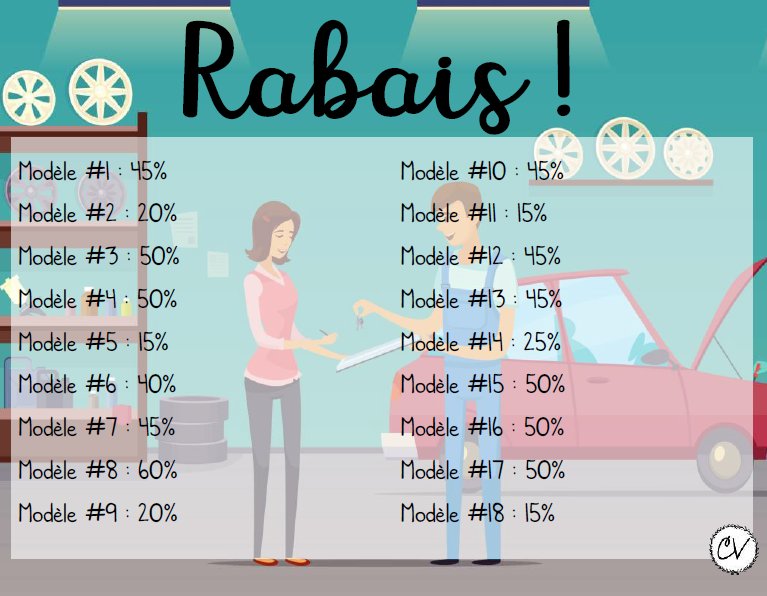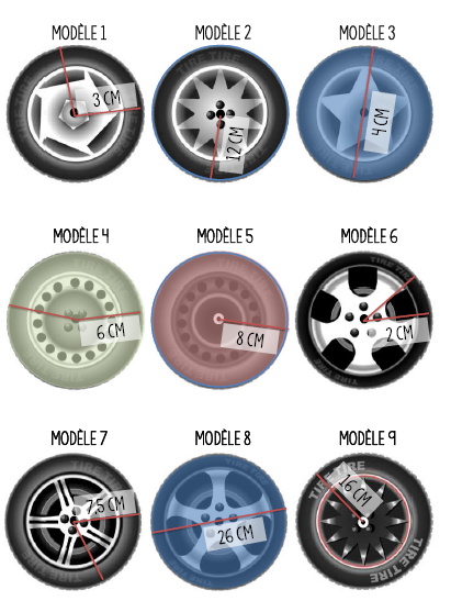 La Roulathèque: le spécialiste des roues! Le gérant promet des rabais à ses clients. Pour déterminer le rabais de chacune des roues, les élèves doivent trouver certaines mesures relatives aux cercles formés par les roues.